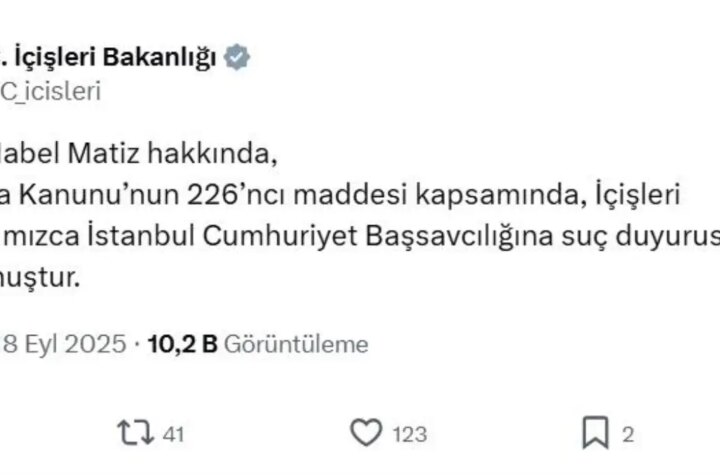 İçişleri Bakanlığı, şarkıcı Mabel Matiz hakkında Türk Ceza Kanunu'nun 226'ncı unsuru çerçevesinde kabahat duyurusunda...